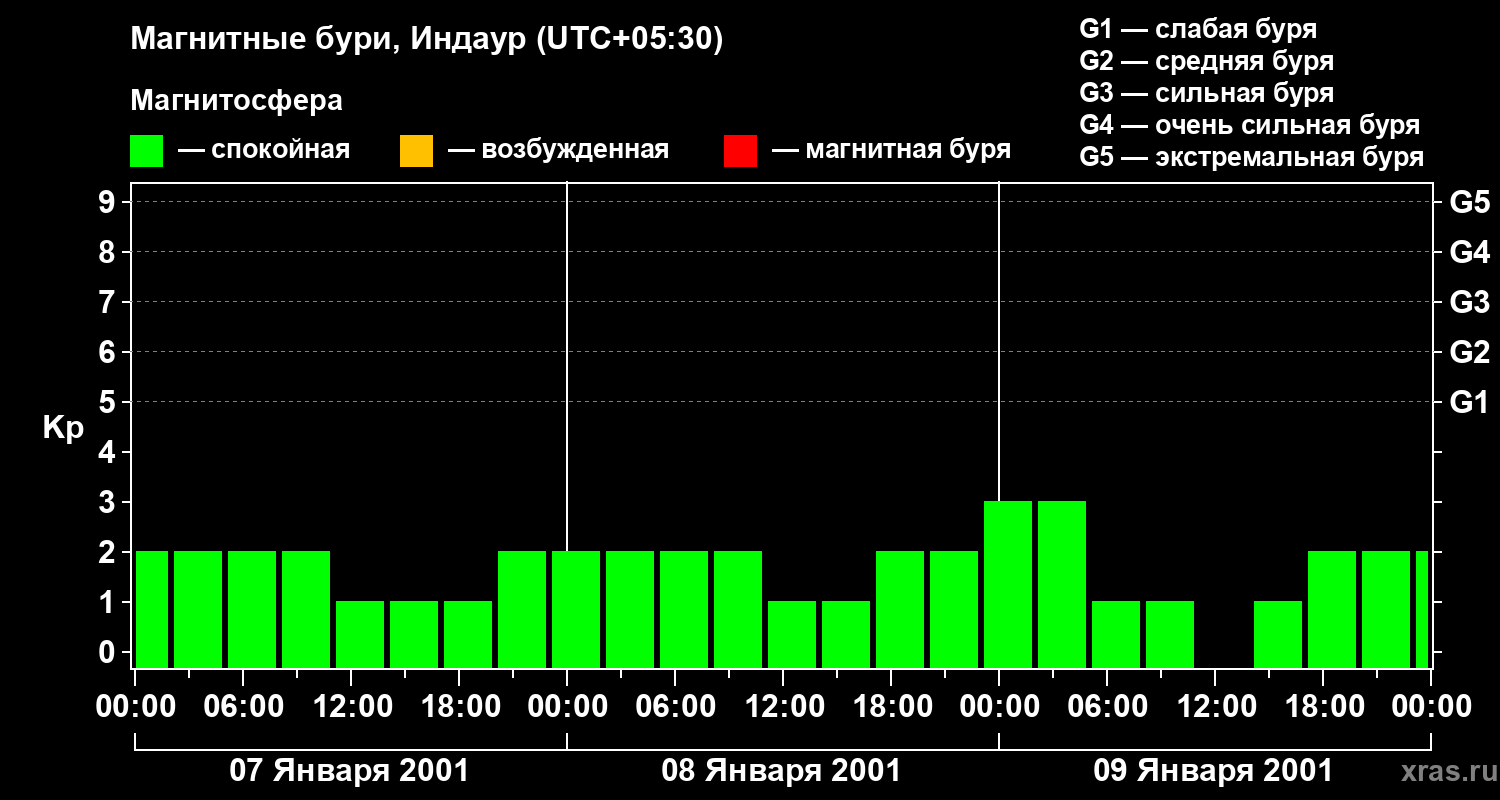 Изменения геомагнитного индекса Kp с 7 по 9 января 2001 года для средних широт