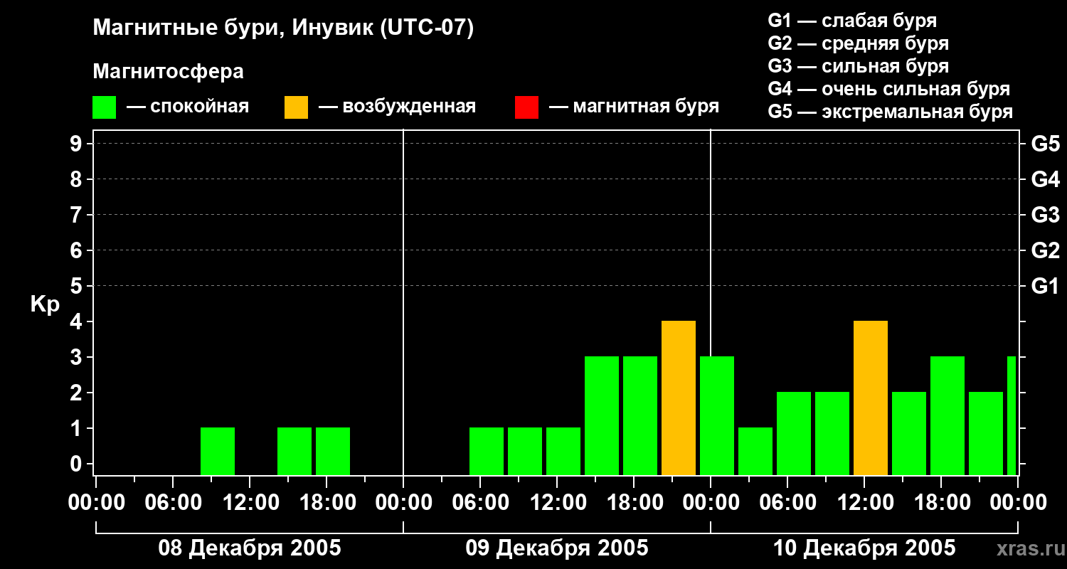 Изменения геомагнитного индекса Kp с 8 по 10 декабря 2005 года для средних широт