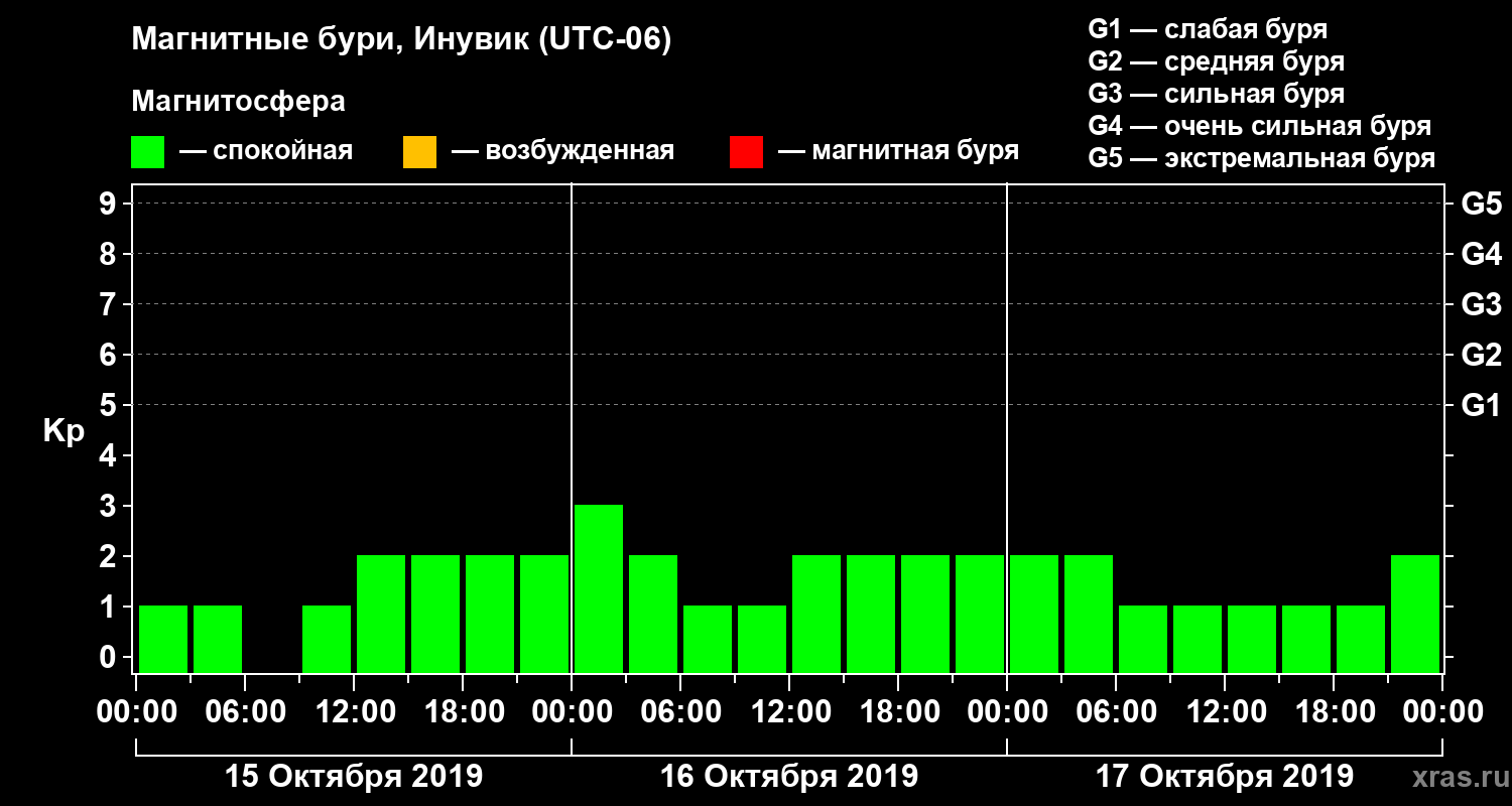 Изменения геомагнитного индекса Kp с 15 по 17 октября 2019 года для средних широт