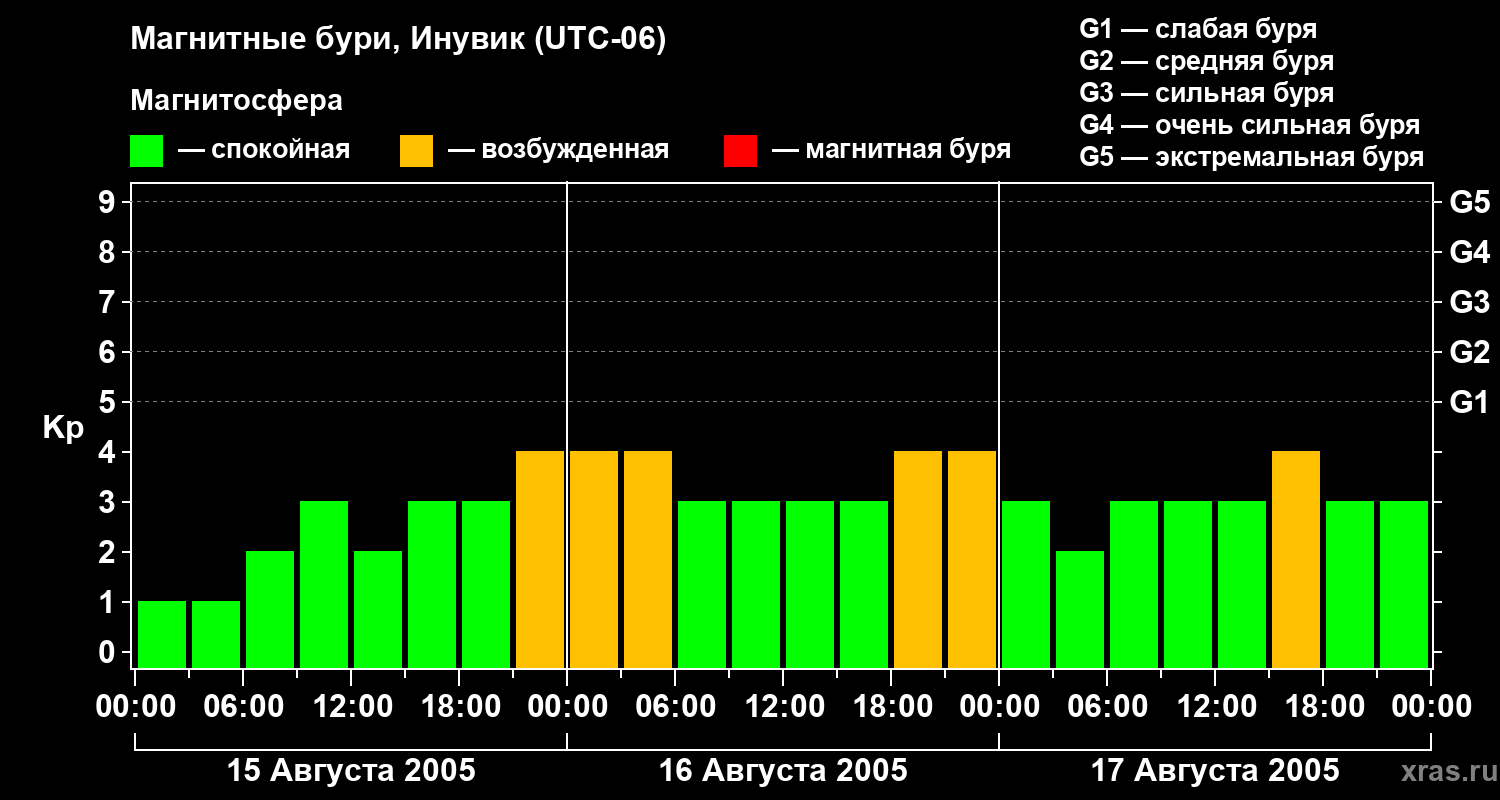 Изменения геомагнитного индекса Kp с 15 по 17 августа 2005 года для средних широт