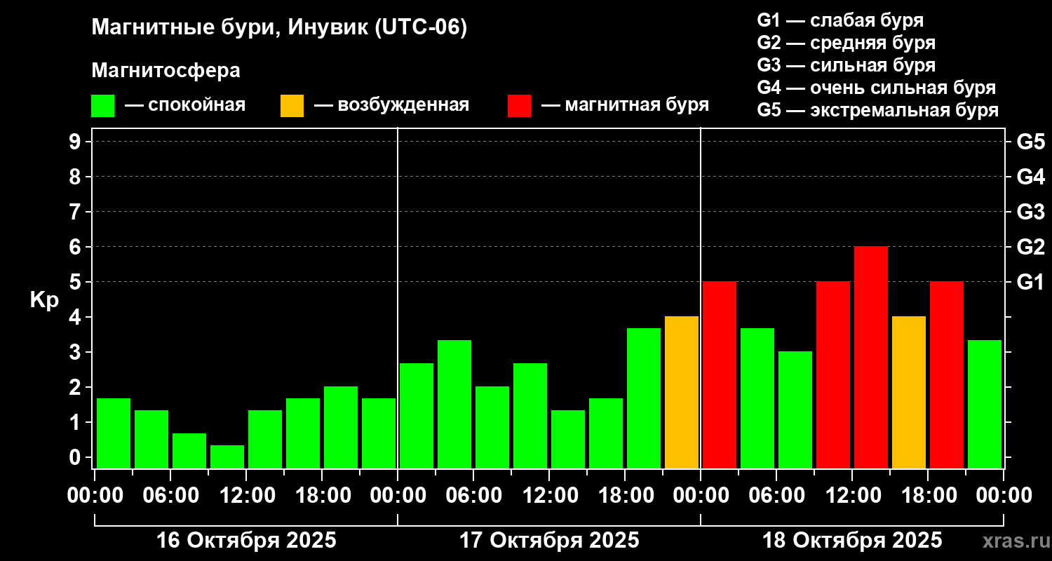 Изменения геомагнитного индекса Kp с 16 по 18 октября 2025 года для средних широт