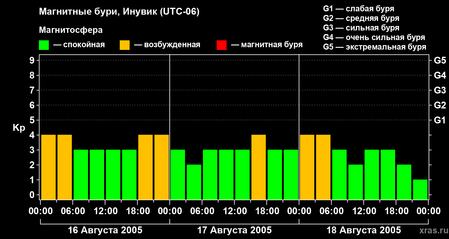Изменения геомагнитного индекса Kp с 16 по 18 августа 2005 года для средних широт