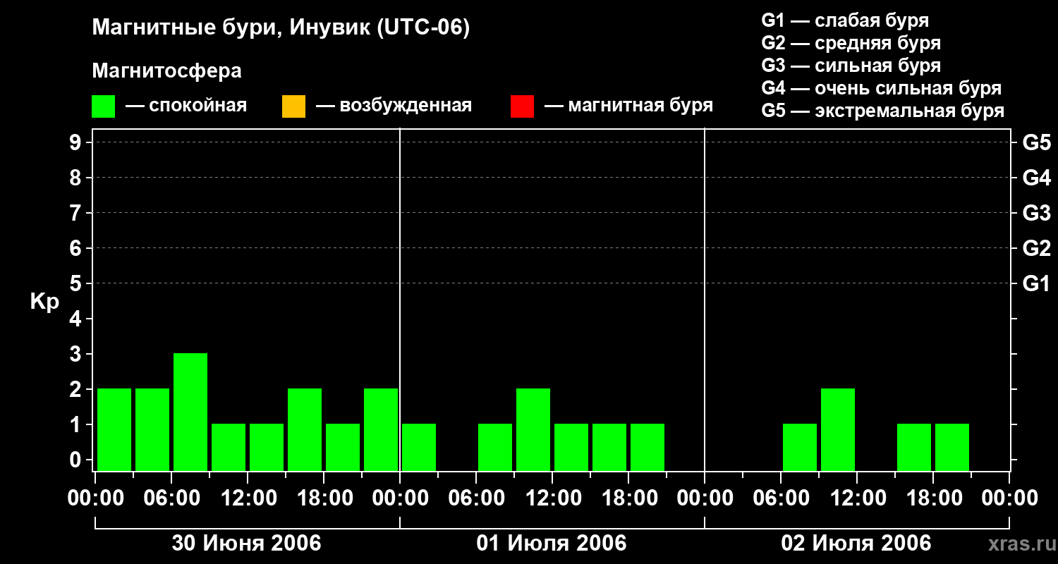 Изменения геомагнитного индекса Kp с 30 июня по 2 июля 2006 года для средних широт