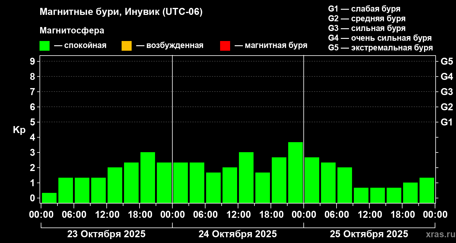 Изменения геомагнитного индекса Kp с 23 по 25 октября 2025 года для средних широт