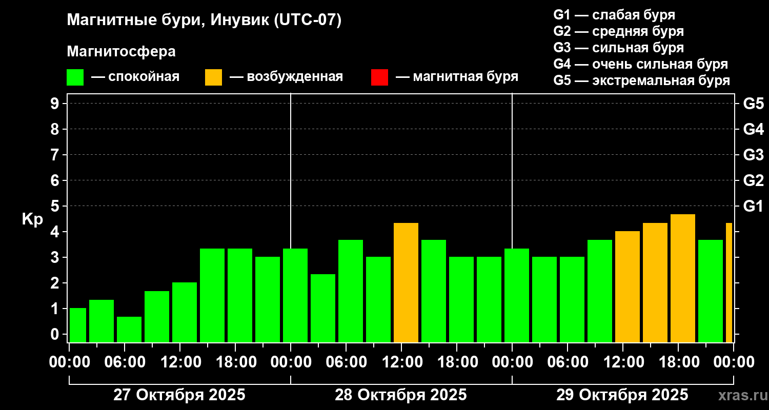 Изменения геомагнитного индекса Kp с 27 по 29 октября 2025 года для средних широт