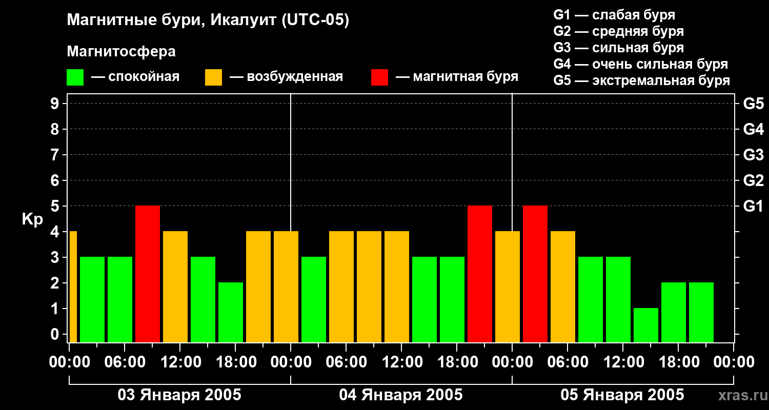 Изменения геомагнитного индекса Kp с 3 по 5 января 2005 года для средних широт