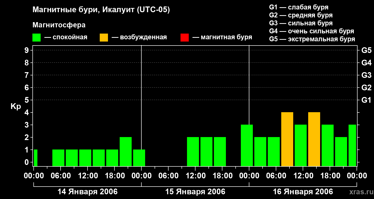 Изменения геомагнитного индекса Kp с 14 по 16 января 2006 года для средних широт