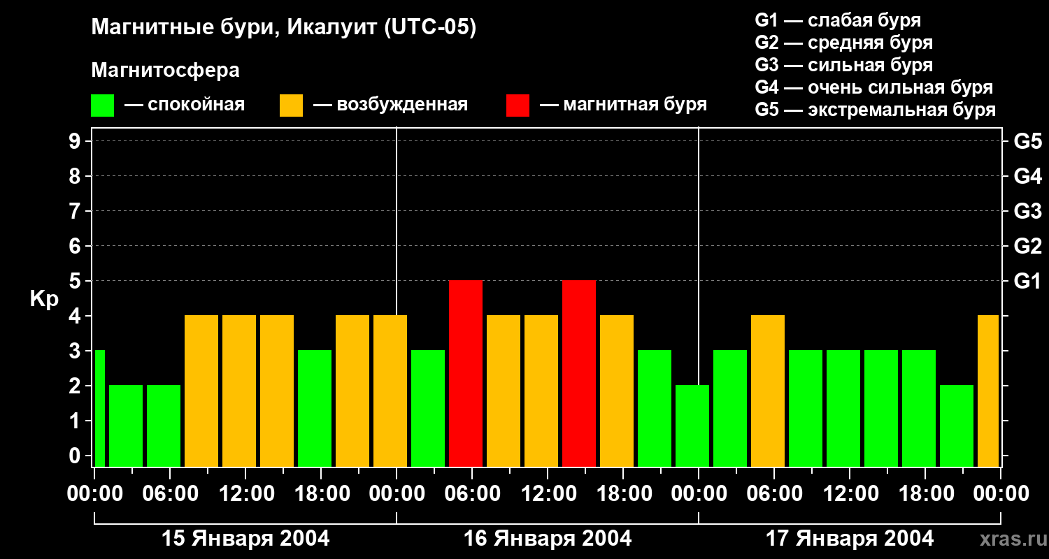 Изменения геомагнитного индекса Kp с 15 по 17 января 2004 года для средних широт