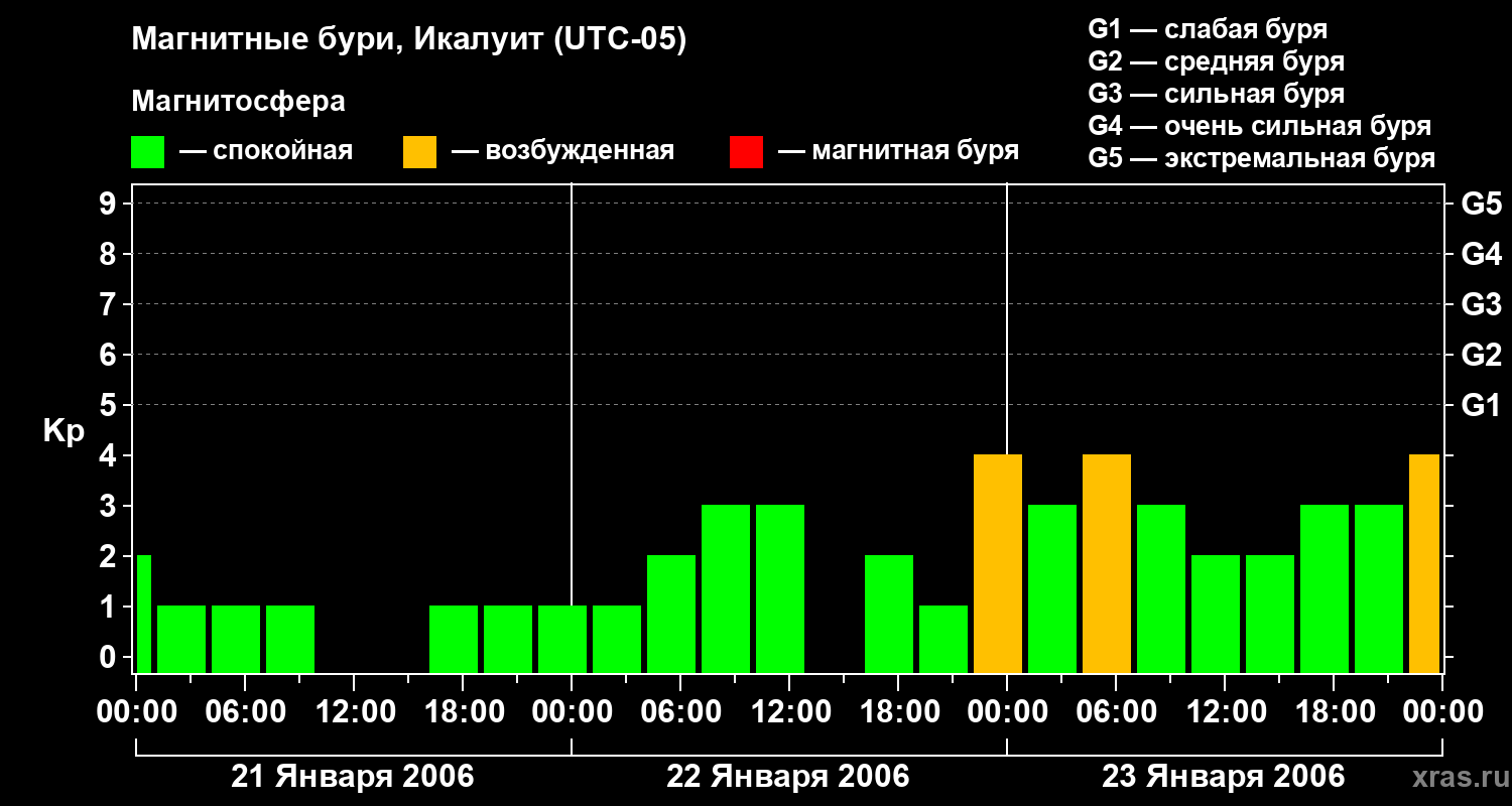 Изменения геомагнитного индекса Kp с 21 по 23 января 2006 года для средних широт