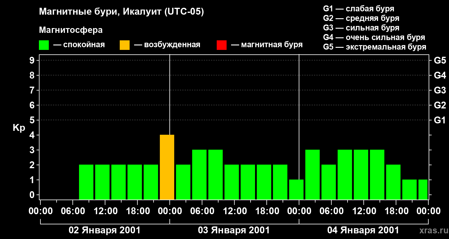 Изменения геомагнитного индекса Kp с 2 по 4 января 2001 года для средних широт