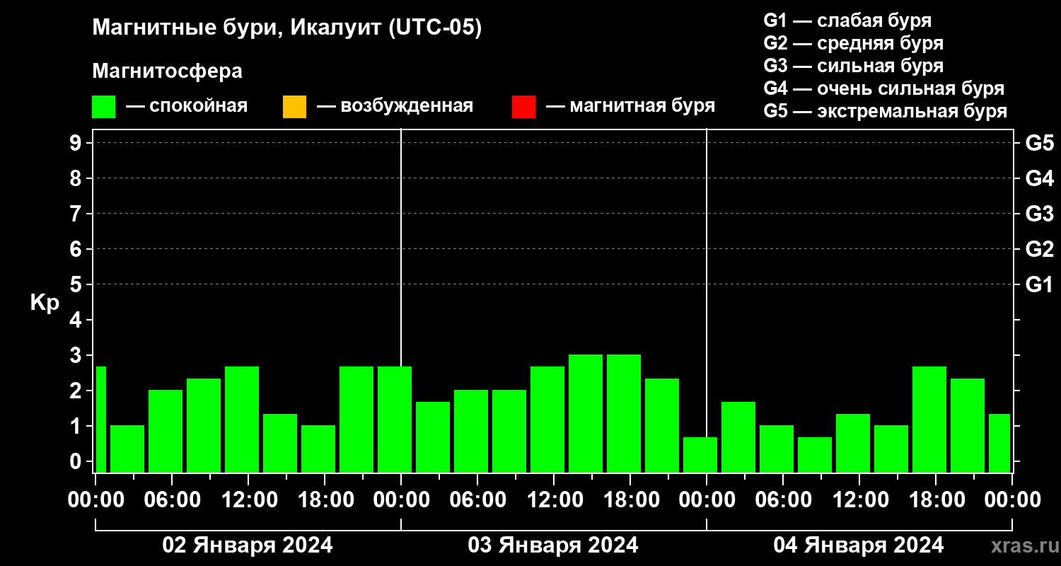 Изменения геомагнитного индекса Kp с 2 по 4 января 2024 года для средних широт