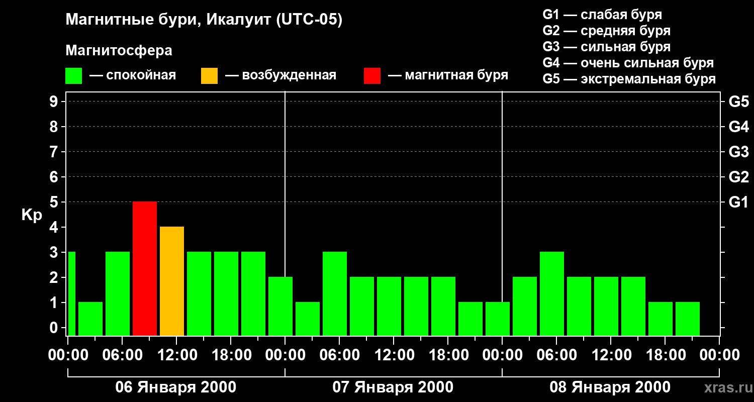 Изменения геомагнитного индекса Kp с 6 по 8 января 2000 года для средних широт