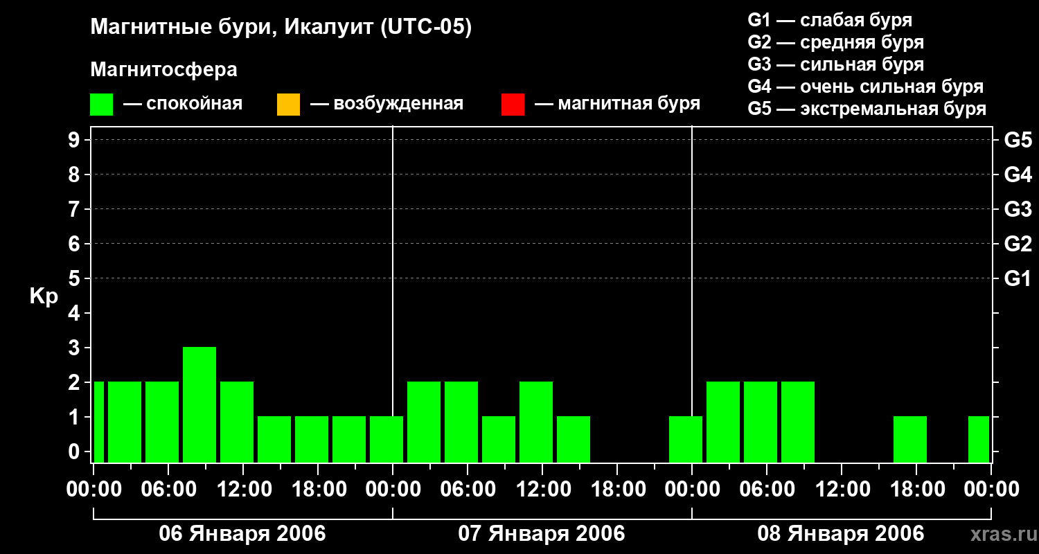 Изменения геомагнитного индекса Kp с 6 по 8 января 2006 года для средних широт