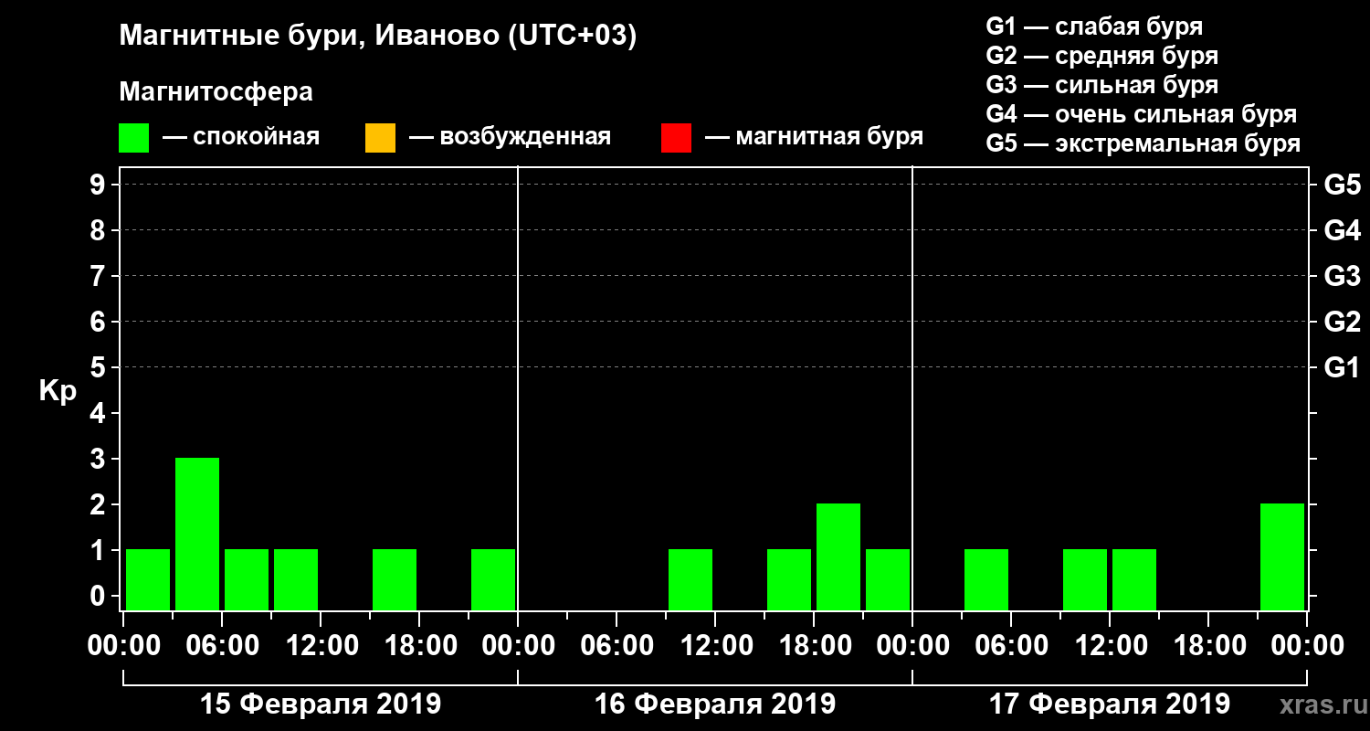 Изменения геомагнитного индекса Kp с 15 по 17 февраля 2019 года для средних широт