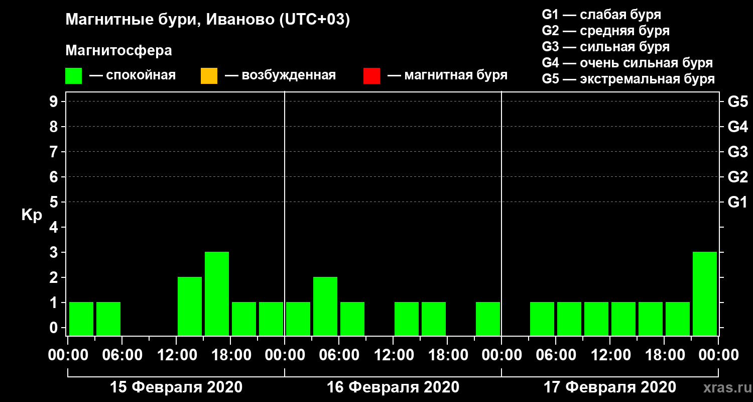 Изменения геомагнитного индекса Kp с 15 по 17 февраля 2020 года для средних широт