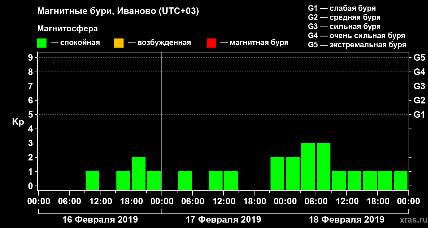 Изменения геомагнитного индекса Kp с 16 по 18 февраля 2019 года для средних широт