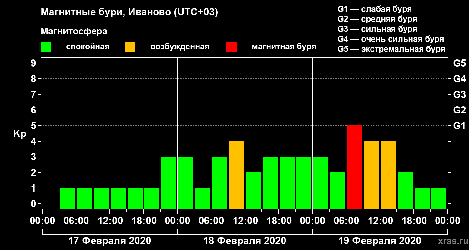 Изменения геомагнитного индекса Kp с 17 по 19 февраля 2020 года для средних широт