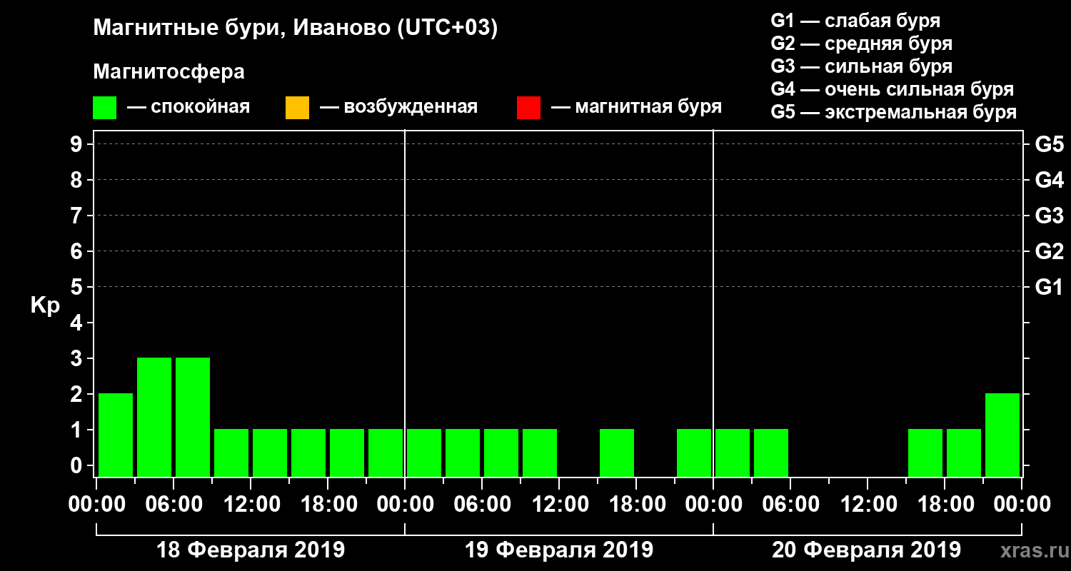 Изменения геомагнитного индекса Kp с 18 по 20 февраля 2019 года для средних широт