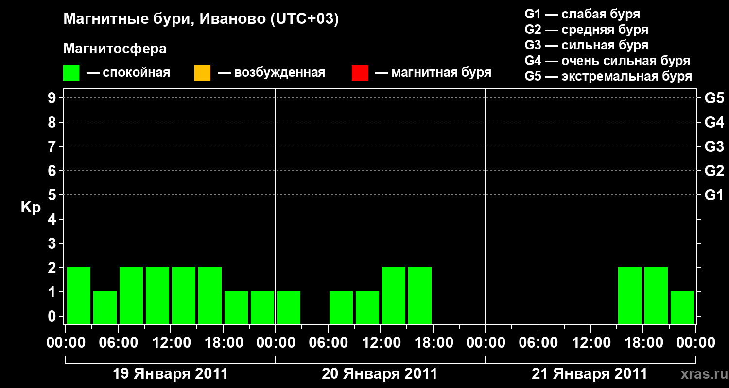 Изменения геомагнитного индекса Kp с 19 по 21 января 2011 года для средних широт
