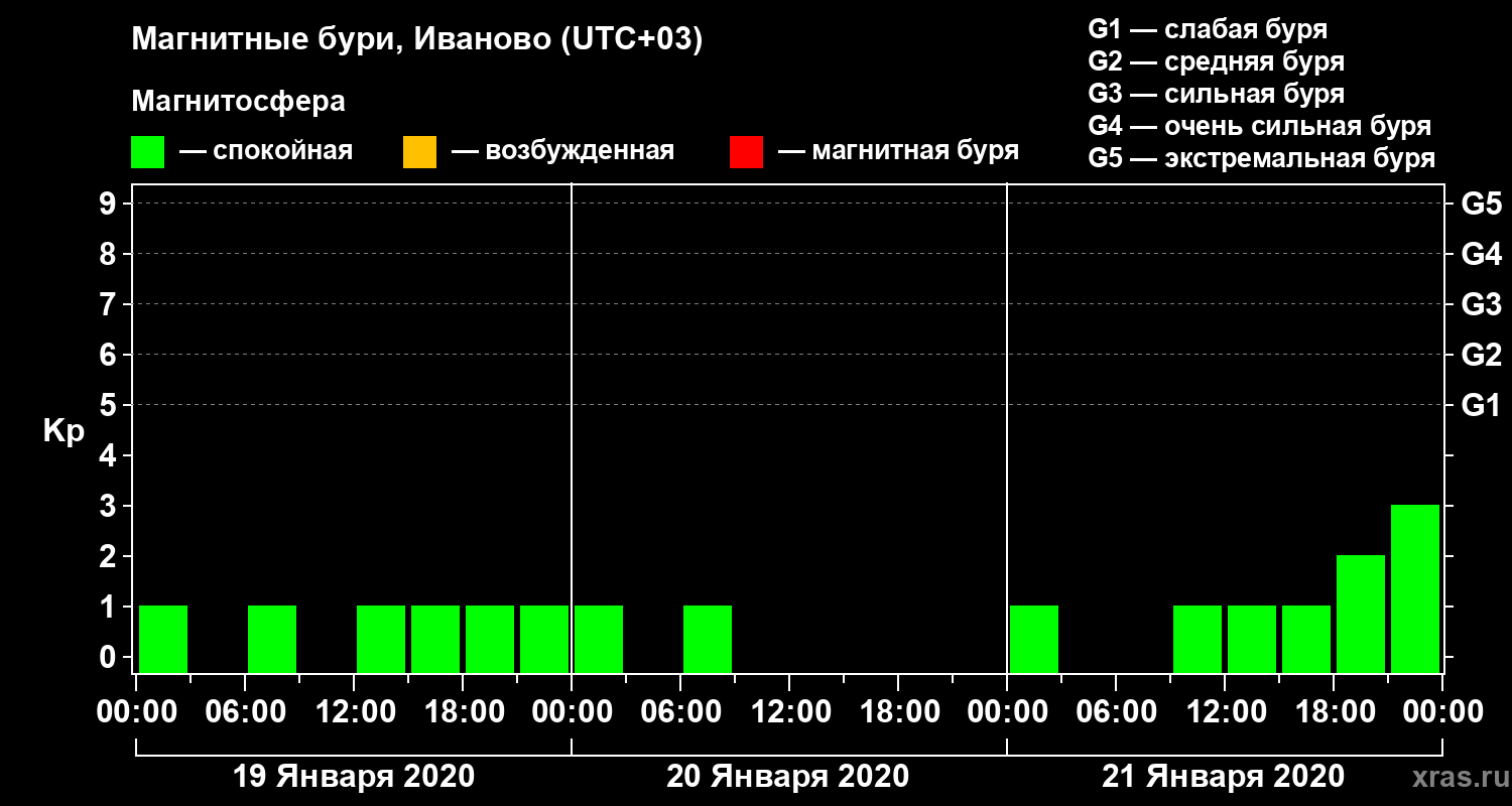 Изменения геомагнитного индекса Kp с 19 по 21 января 2020 года для средних широт
