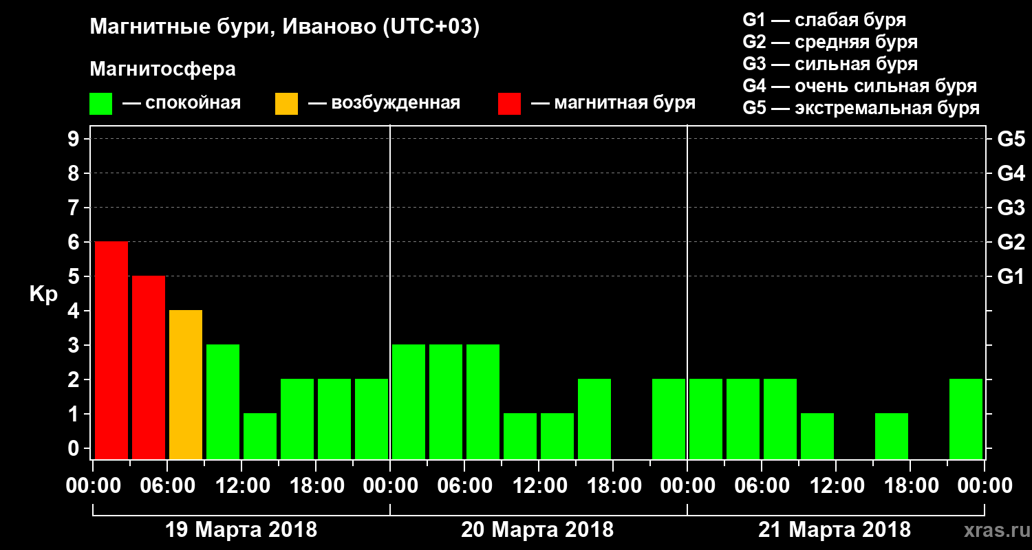 Изменения геомагнитного индекса Kp с 19 по 21 марта 2018 года для средних широт