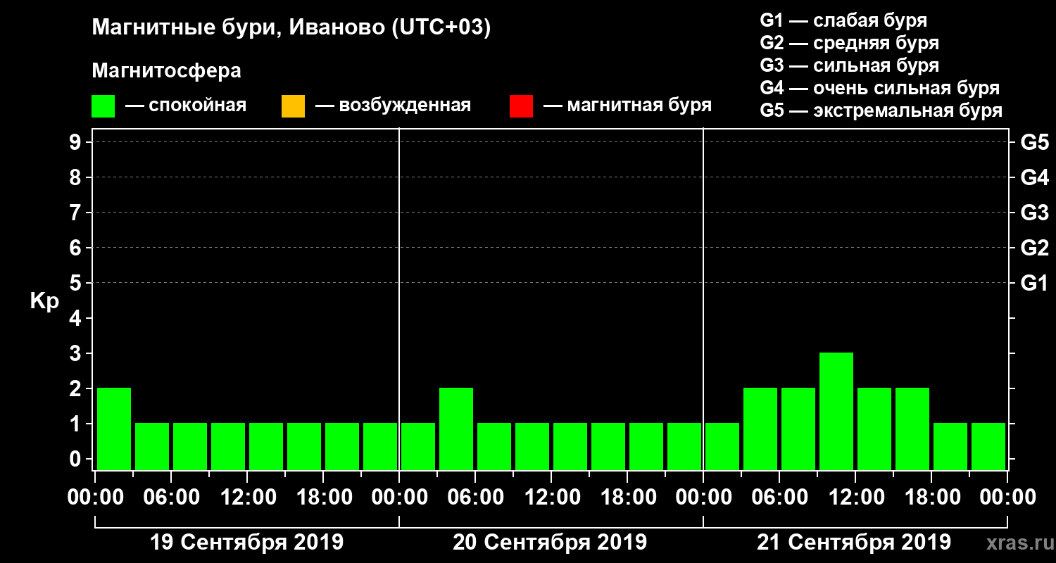 Изменения геомагнитного индекса Kp с 19 по 21 сентября 2019 года для средних широт
