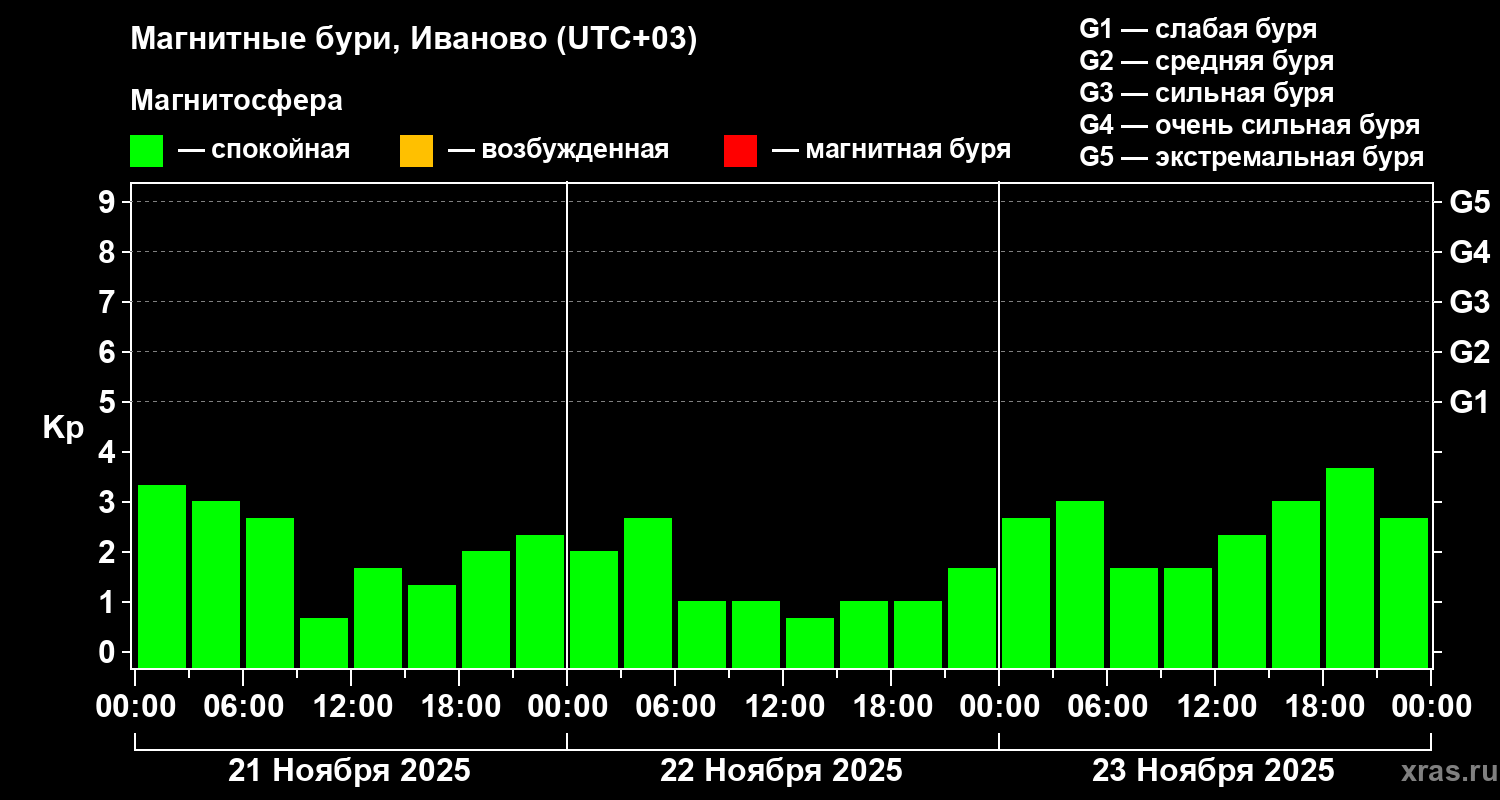 Изменения геомагнитного индекса Kp с 21 по 23 ноября 2025 года для средних широт