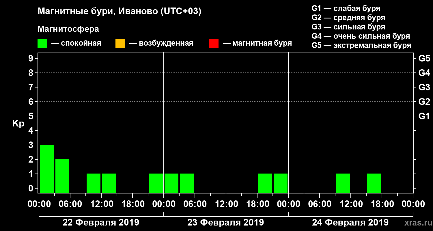 Изменения геомагнитного индекса Kp с 22 по 24 февраля 2019 года для средних широт