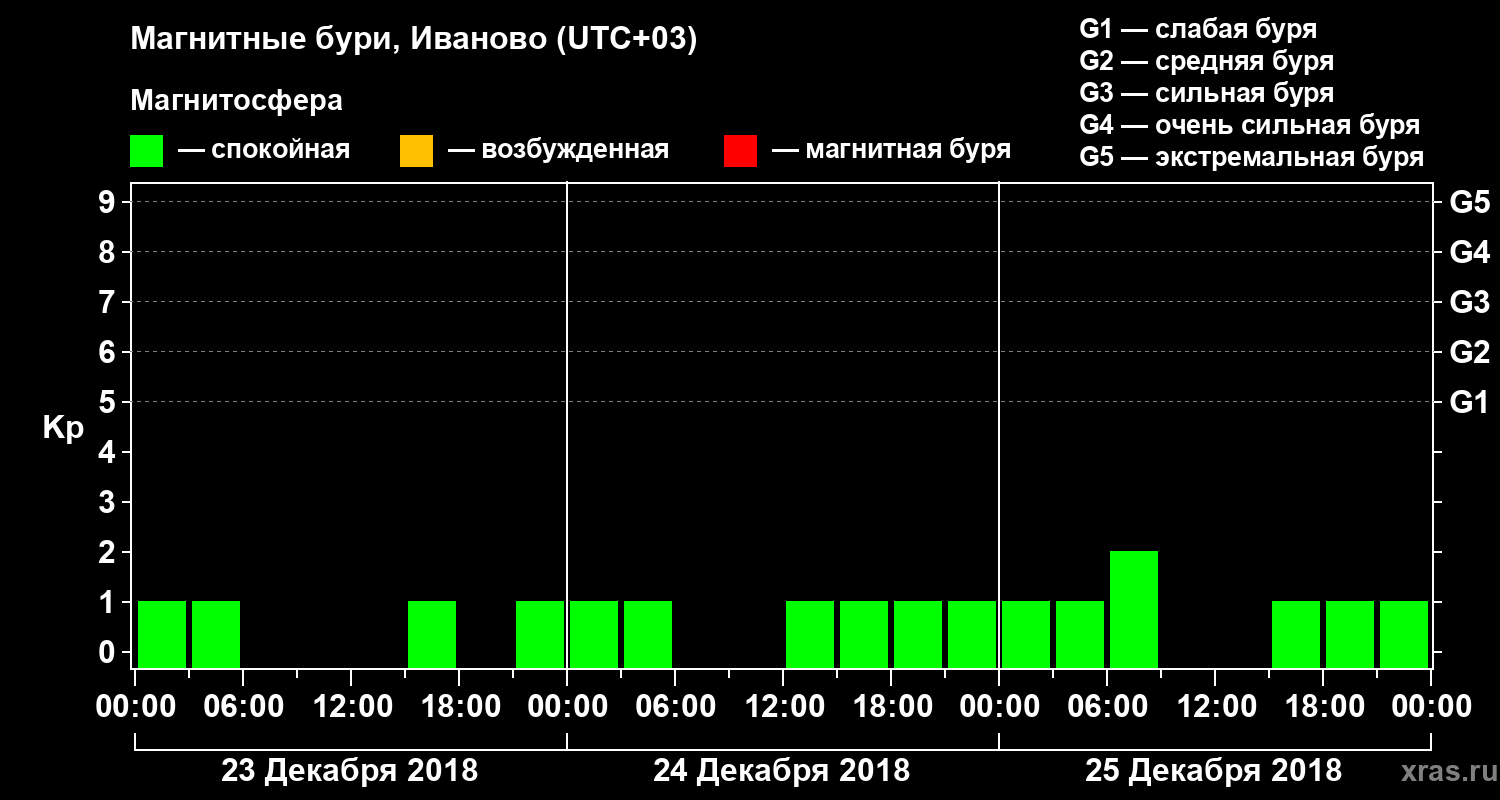 Изменения геомагнитного индекса Kp с 23 по 25 декабря 2018 года для средних широт
