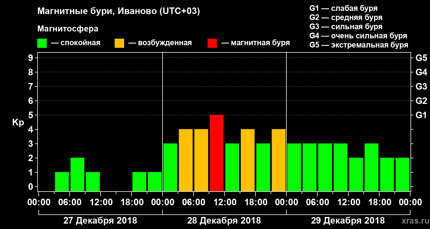 Изменения геомагнитного индекса Kp с 27 по 29 декабря 2018 года для средних широт