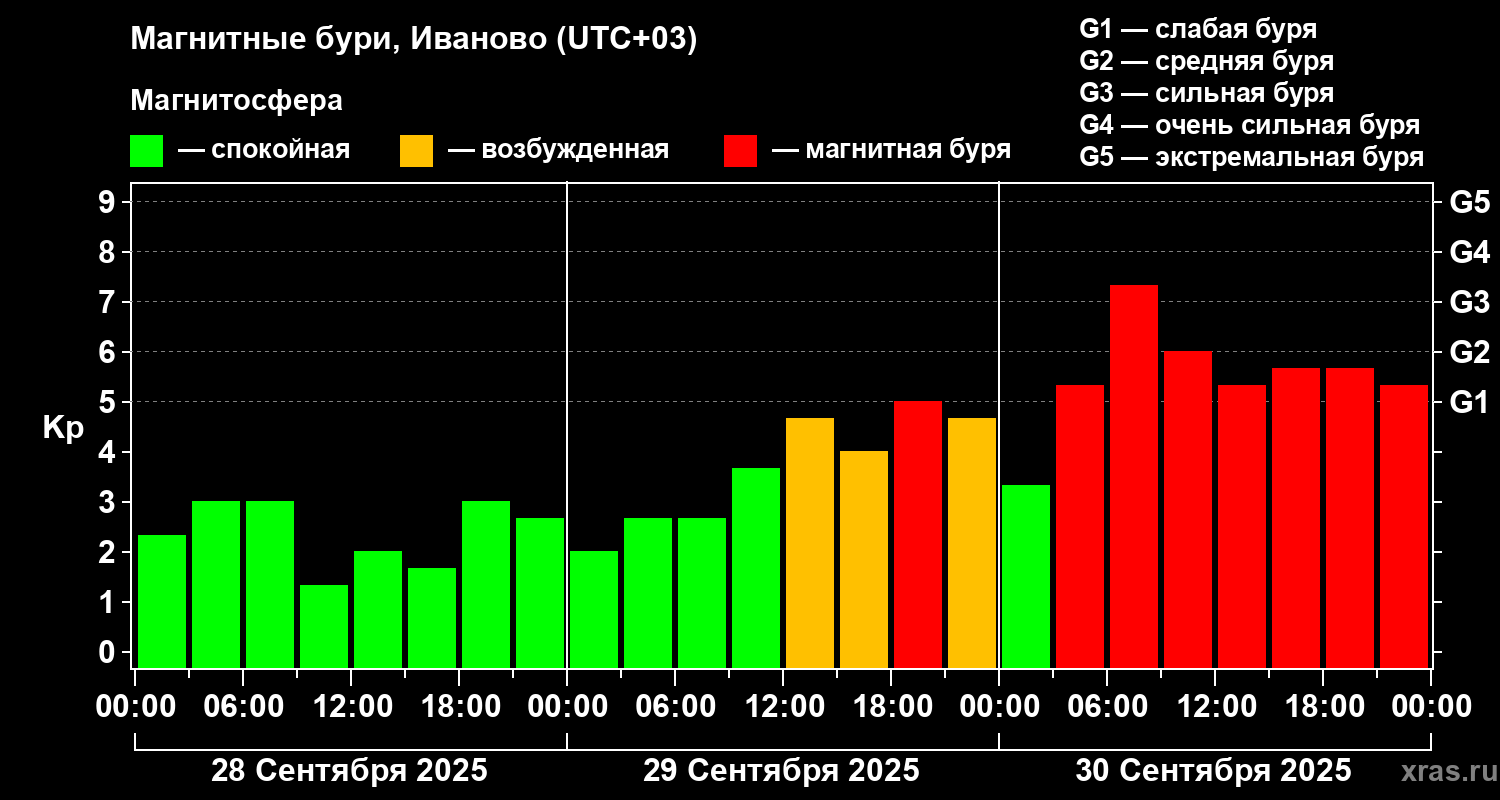 Изменения геомагнитного индекса Kp с 28 по 30 сентября 2025 года для средних широт