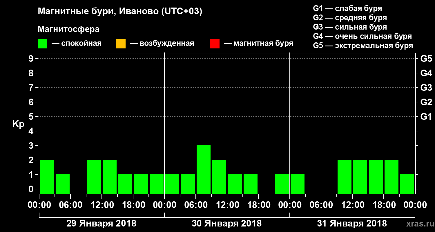 Изменения геомагнитного индекса Kp с 29 по 31 января 2018 года для средних широт