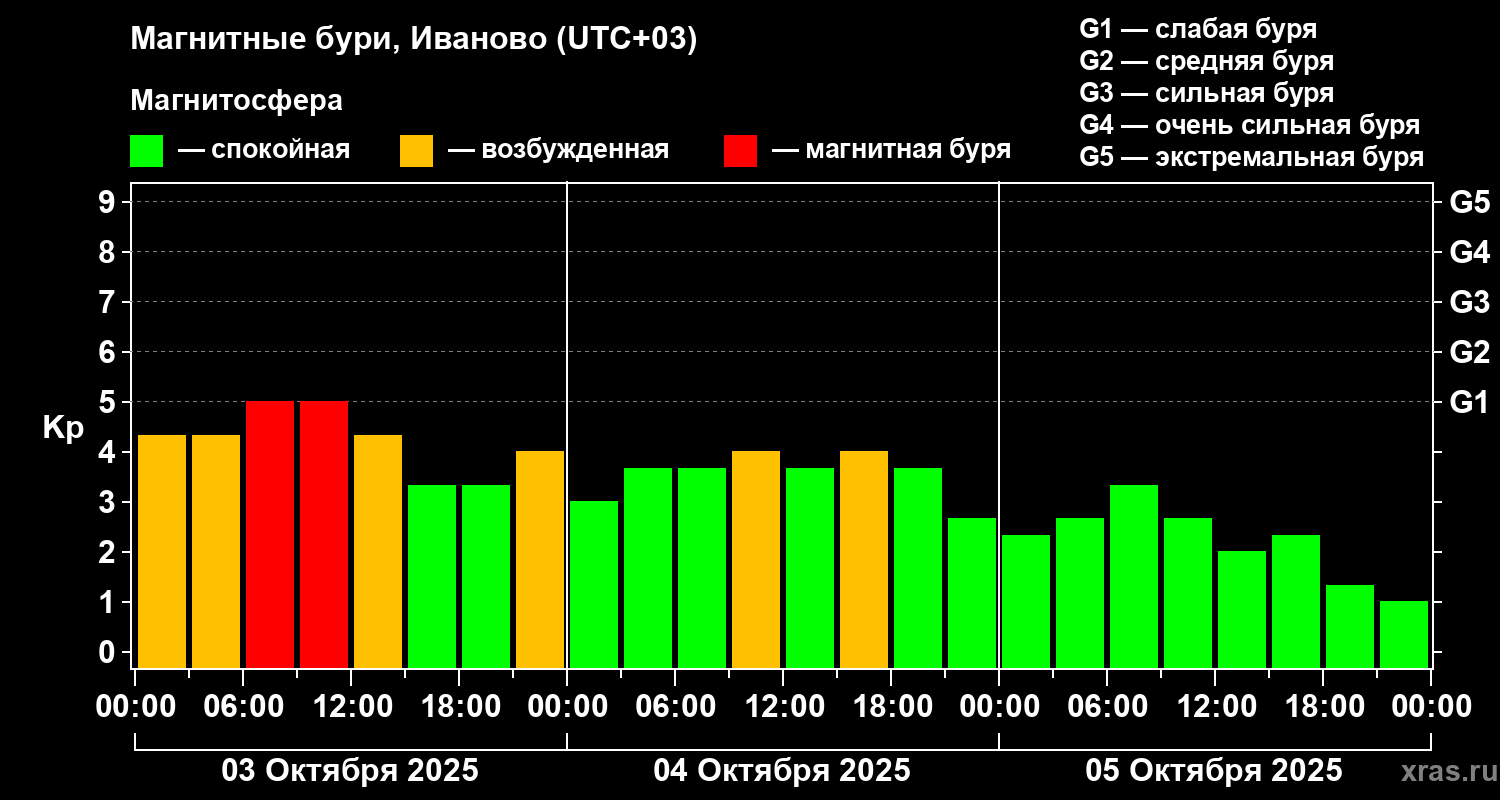 Изменения геомагнитного индекса Kp с 3 по 5 октября 2025 года для средних широт