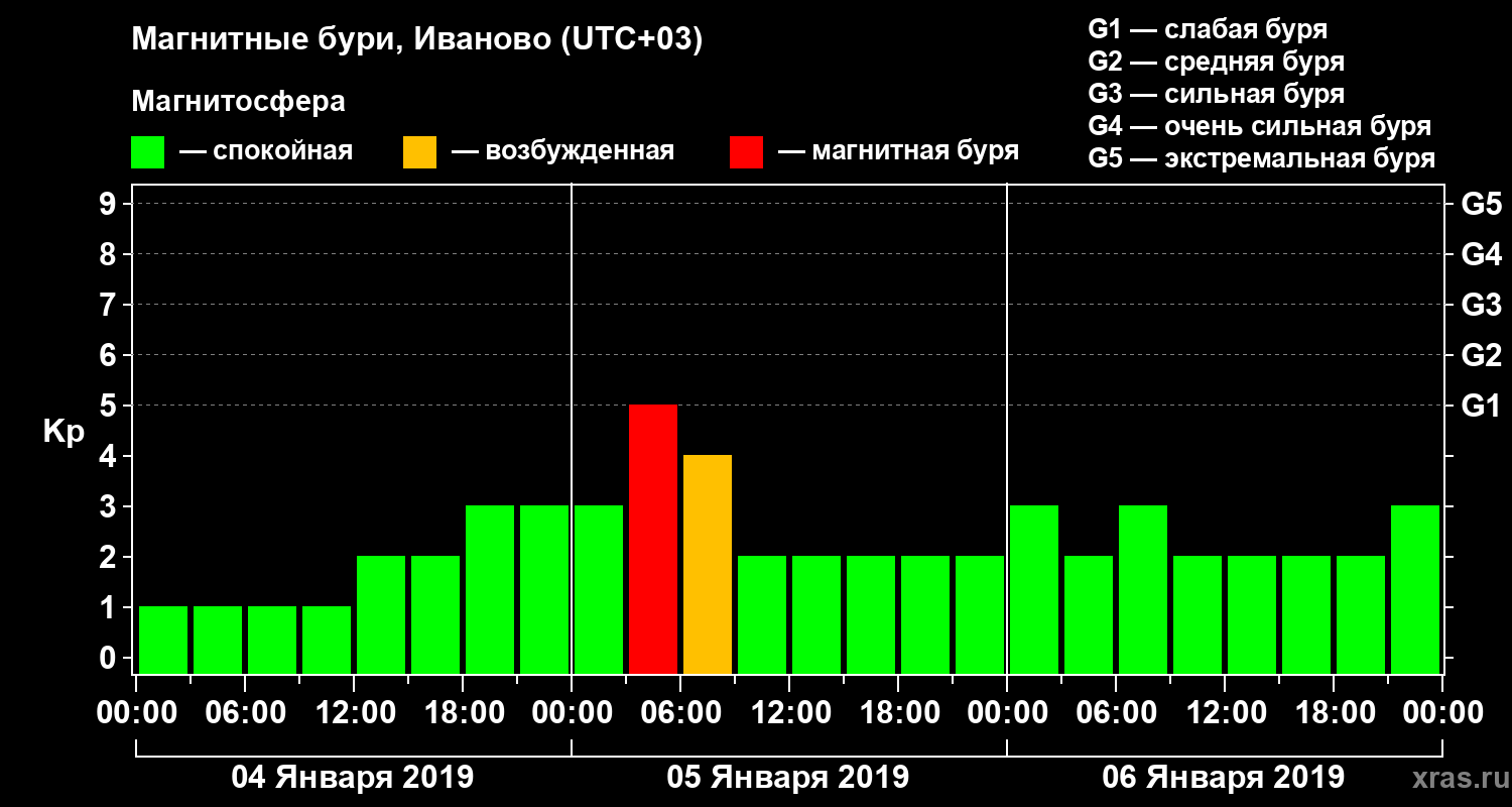 Изменения геомагнитного индекса Kp с 4 по 6 января 2019 года для средних широт