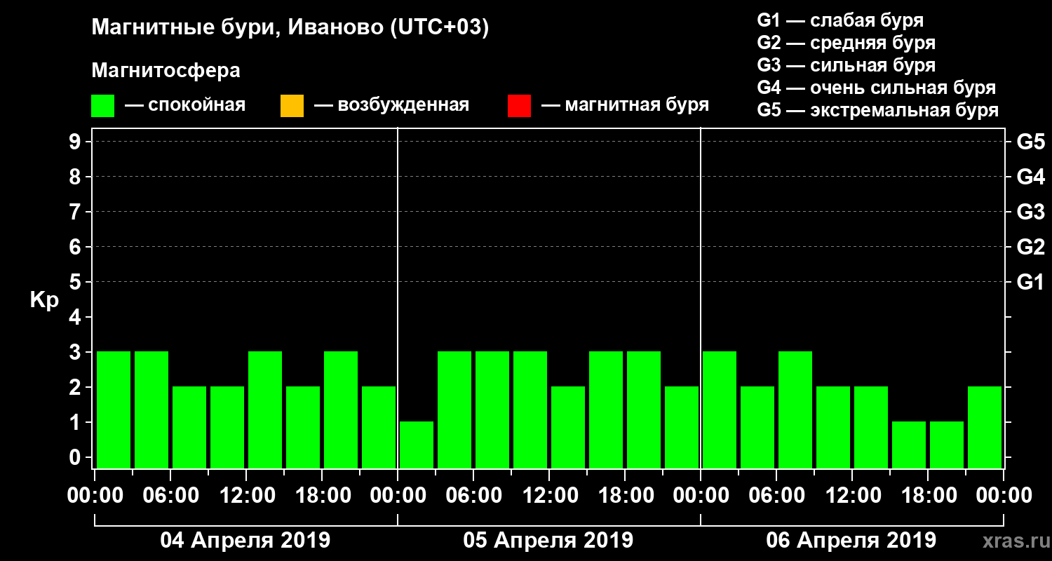 Изменения геомагнитного индекса Kp с 4 по 6 апреля 2019 года для средних широт