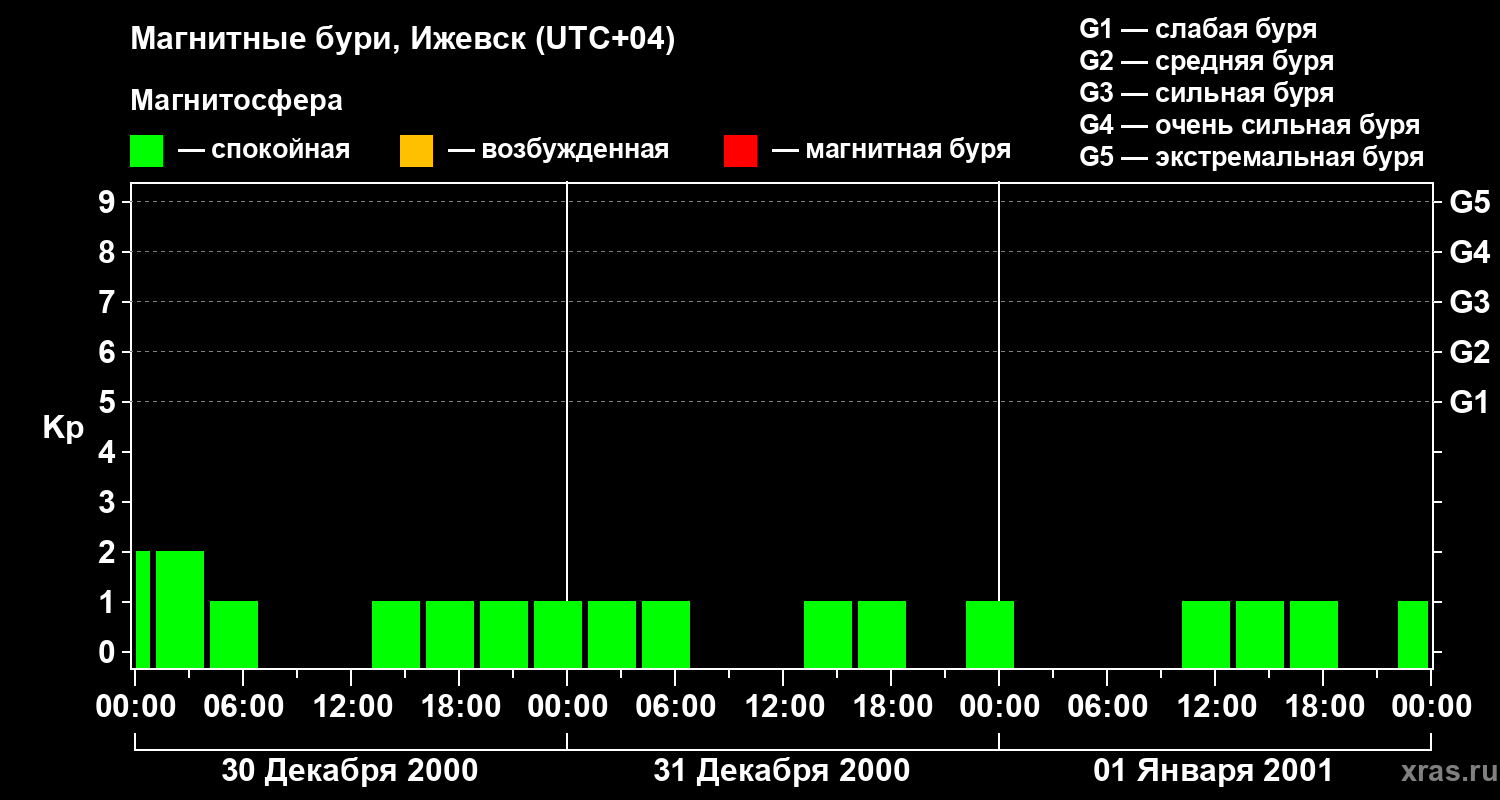 Изменения геомагнитного индекса Kp с 30 декабря 2000 года по 1 января 2001 года для средних широт