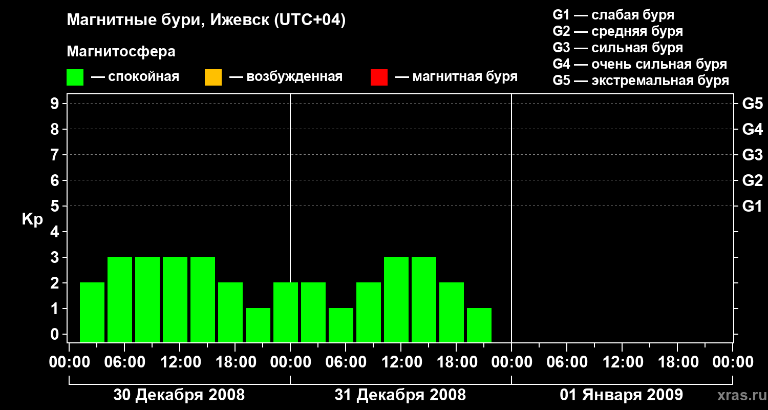 Изменения геомагнитного индекса Kp с 30 декабря 2008 года по 1 января 2009 года для средних широт