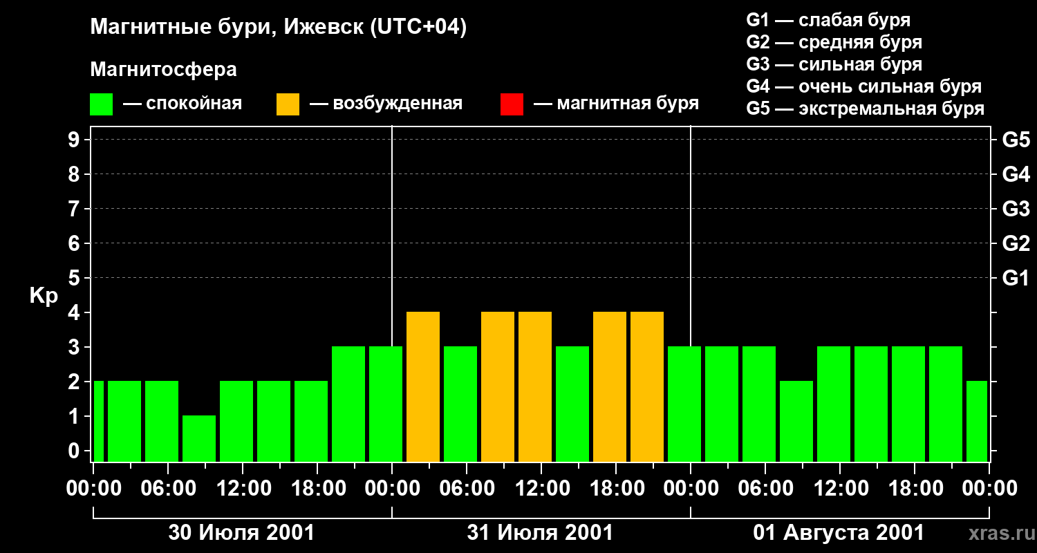 Изменения геомагнитного индекса Kp с 30 июля по 1 августа 2001 года для средних широт