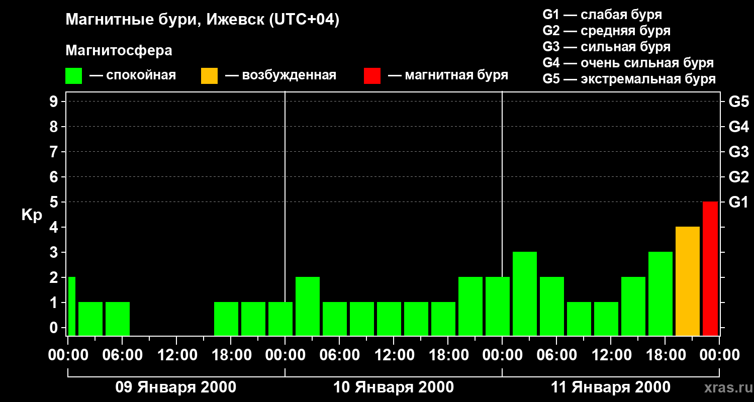 Изменения геомагнитного индекса Kp с 9 по 11 января 2000 года для средних широт