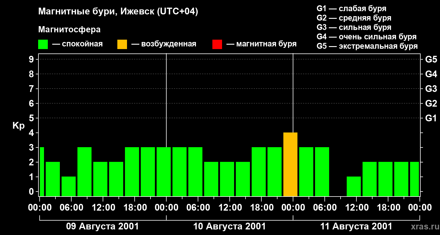 Изменения геомагнитного индекса Kp с 9 по 11 августа 2001 года для средних широт