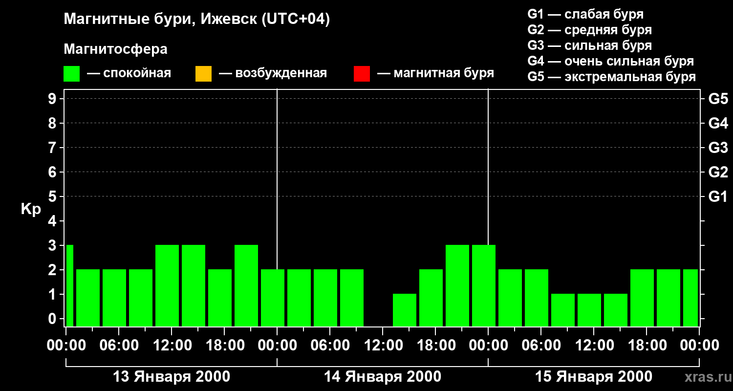 Изменения геомагнитного индекса Kp с 13 по 15 января 2000 года для средних широт