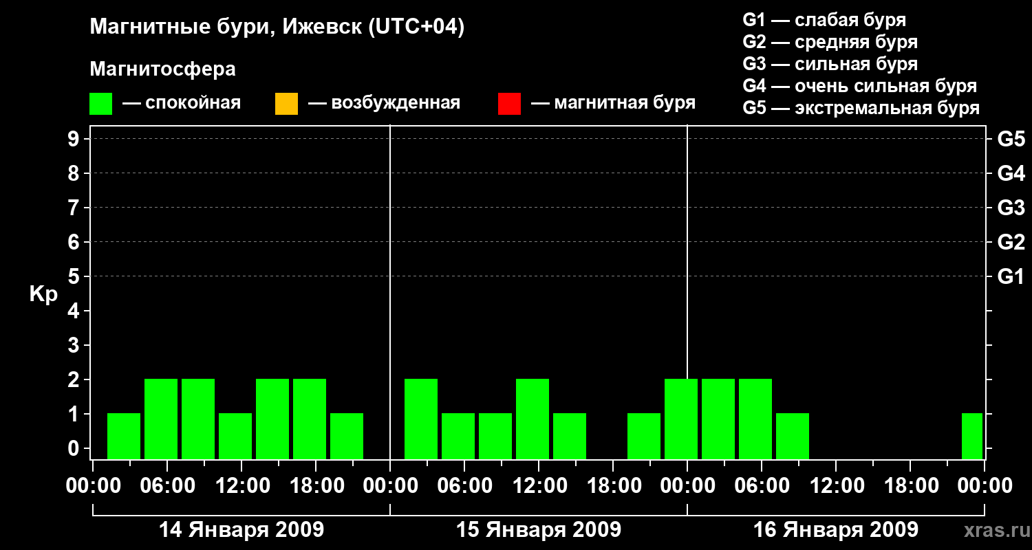 Изменения геомагнитного индекса Kp с 14 по 16 января 2009 года для средних широт