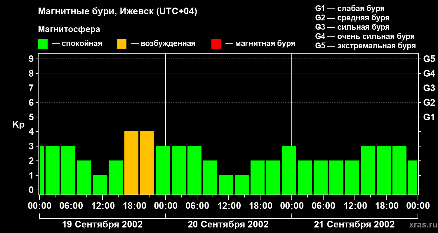 Изменения геомагнитного индекса Kp с 19 по 21 сентября 2002 года для средних широт