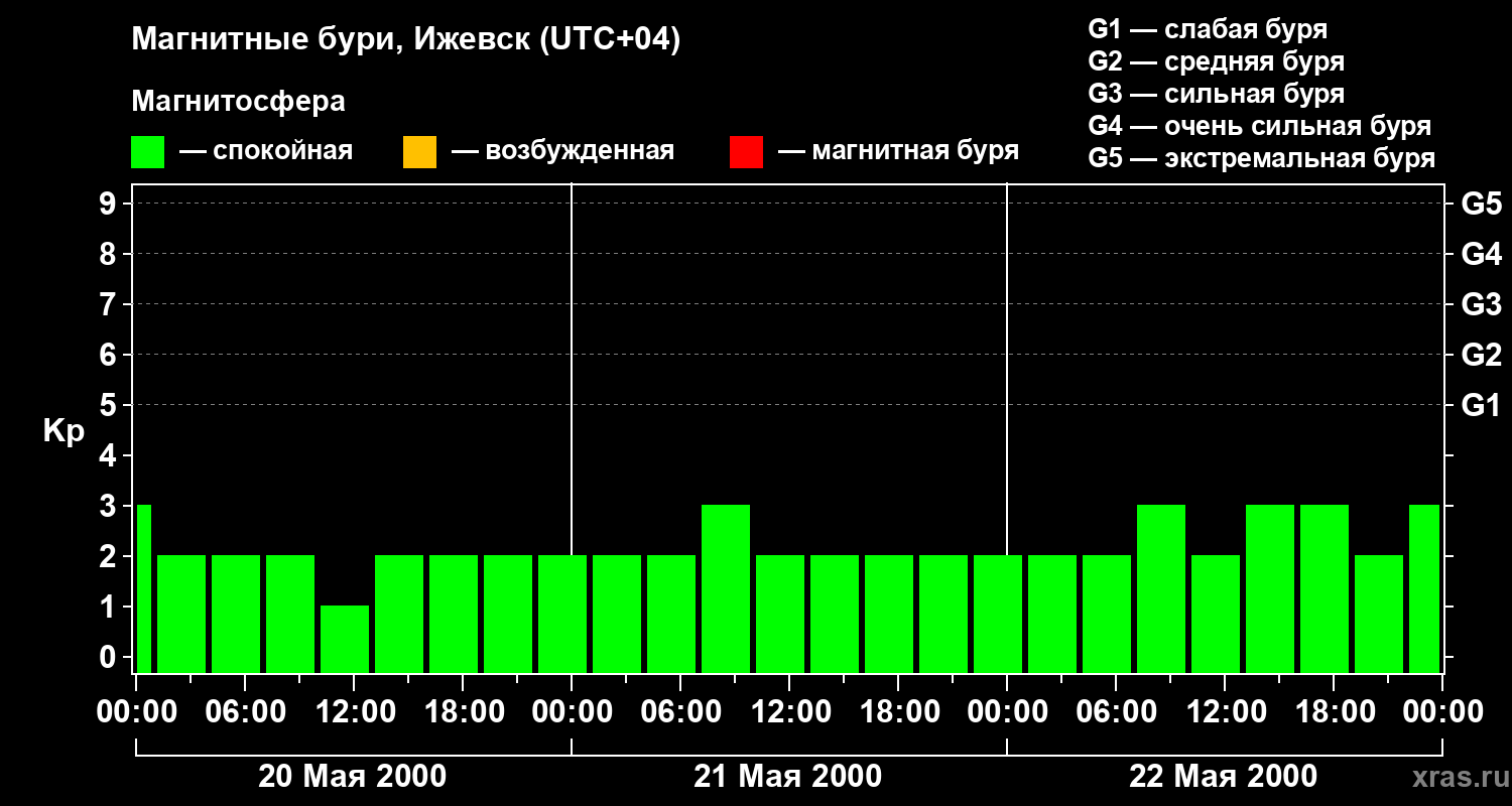 Изменения геомагнитного индекса Kp с 20 по 22 мая 2000 года для средних широт