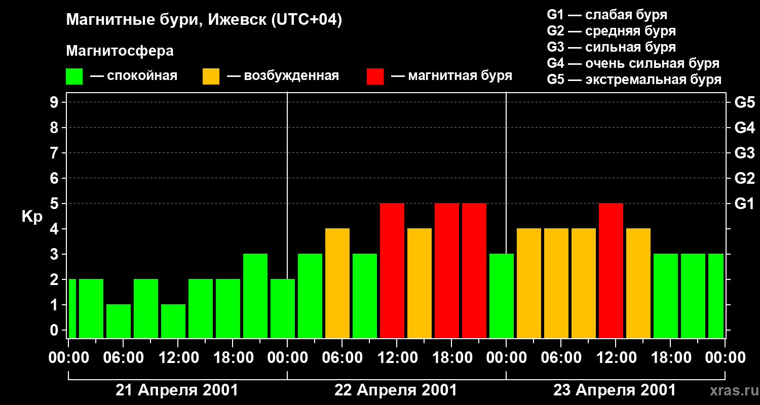Изменения геомагнитного индекса Kp с 21 по 23 апреля 2001 года для средних широт