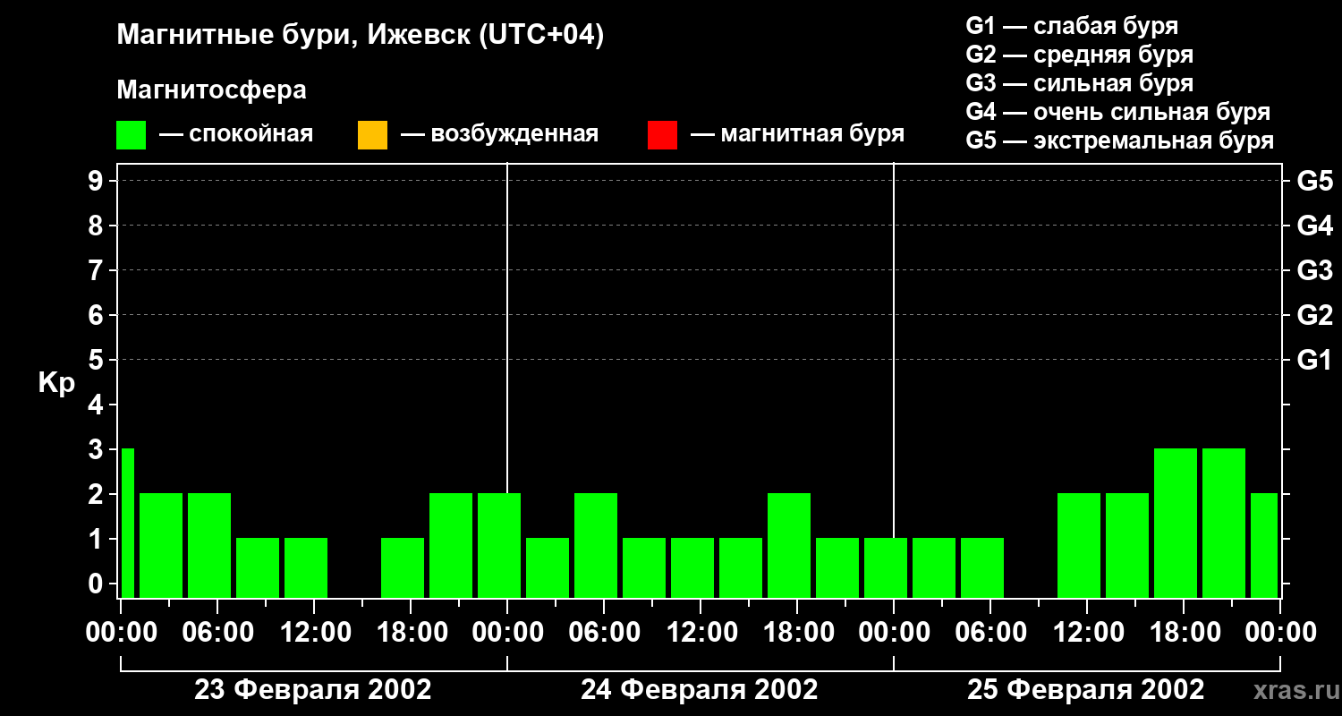 Изменения геомагнитного индекса Kp с 23 по 25 февраля 2002 года для средних широт