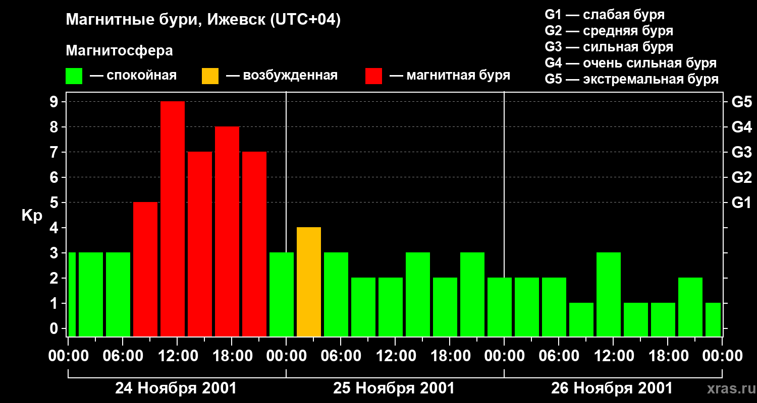 Изменения геомагнитного индекса Kp с 24 по 26 ноября 2001 года для средних широт