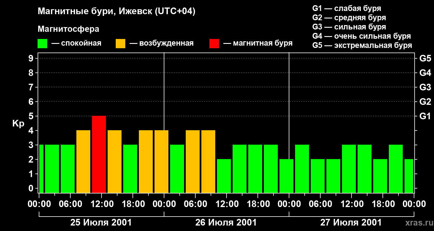 Изменения геомагнитного индекса Kp с 25 по 27 июля 2001 года для средних широт
