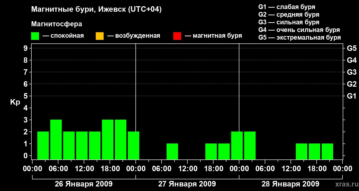 Изменения геомагнитного индекса Kp с 26 по 28 января 2009 года для средних широт