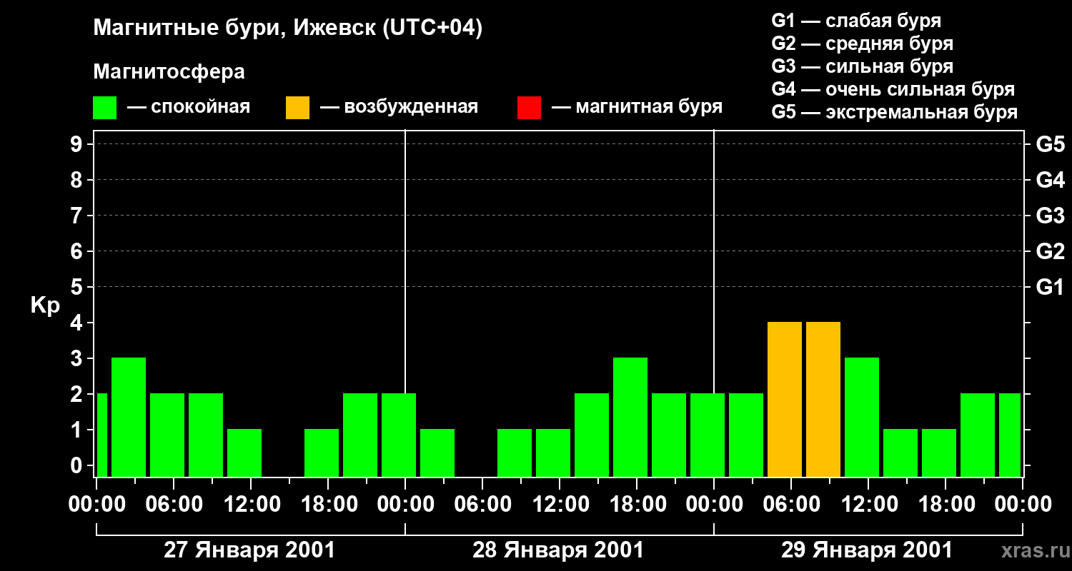 Изменения геомагнитного индекса Kp с 27 по 29 января 2001 года для средних широт